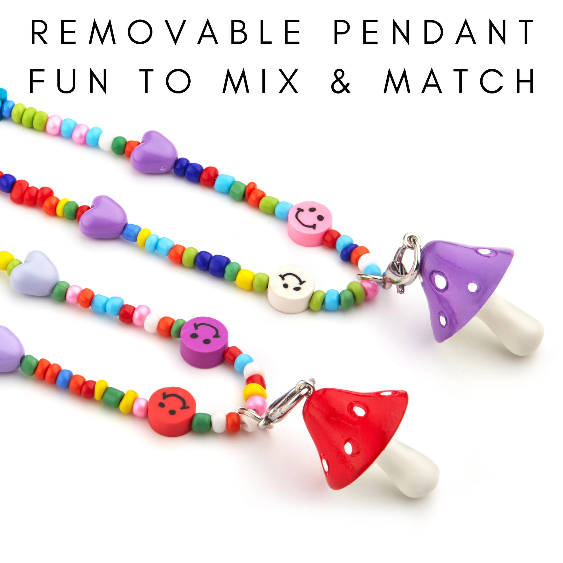 Mushroom pendants are randomly packed among pink, purple and red. Removable pendant design. Fun to mix and match for your unique style.