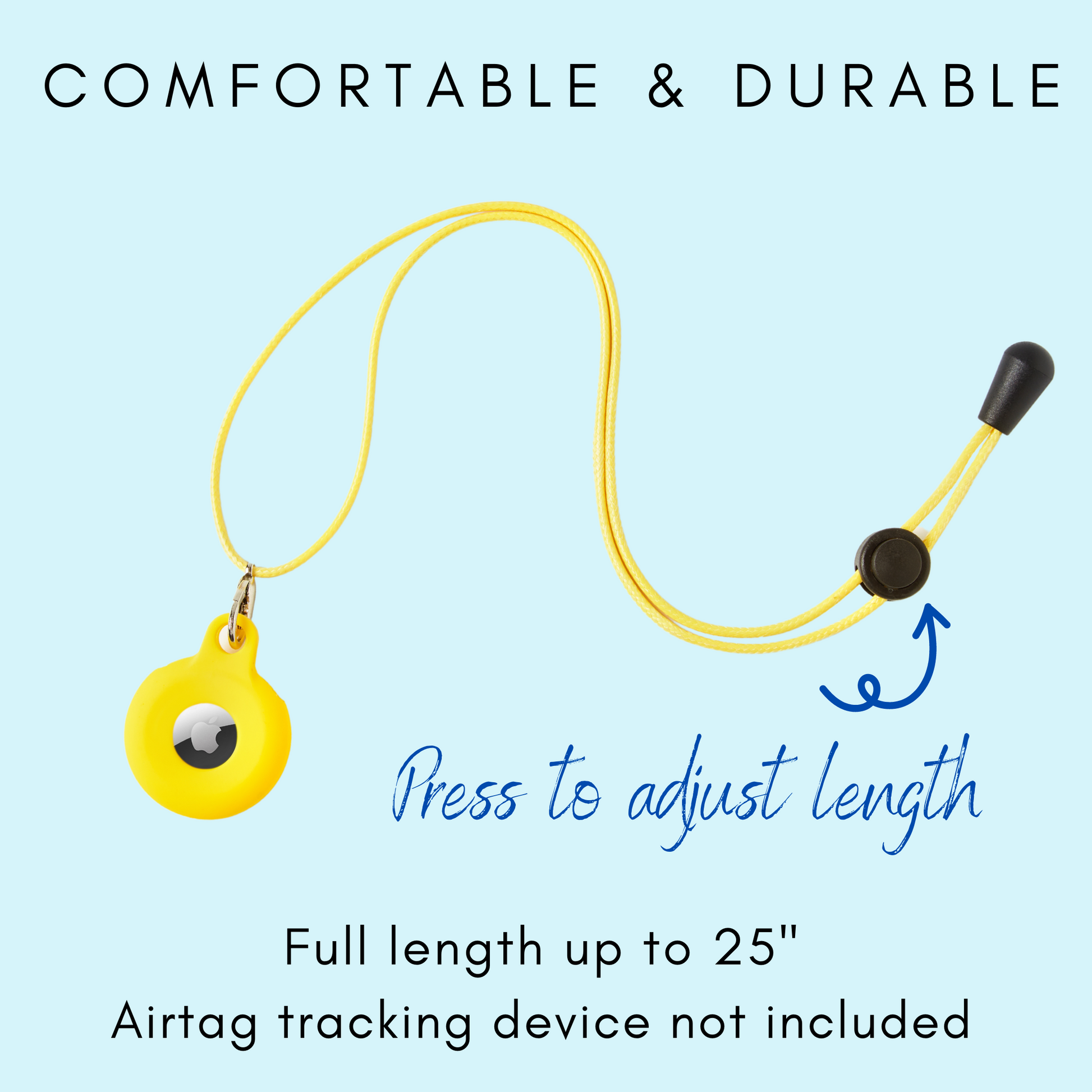 Comfy & resilient, the air tag necklace is crafted with a soft cord & length adjuster. Not to mention, it's stylish and fun to wear! The adjustable air tag band is constructed with soft elastic nylon & a secure velcro band—perfectly sized for kids (3 1/2''– 5 3/4"). Easily convert into an airtag wristband or airtag anklet for toddlers. Plus, it's hand-washable and anti scratch.